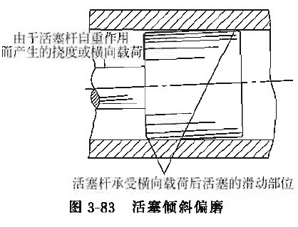 1、活塞与缸孔间隙太大。若活塞与缸筒内孔配合间隙太大,在长度很大的活塞杆自重作用下, 活塞杆挠曲,或者即使活塞杆不挠曲,但由于自重,产生的弯曲力矩若大于活塞的倾覆力矩时, 则活塞将处于倾斜姿势沿缸壁运动而发生偏磨, 如图3-83所示。