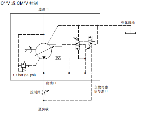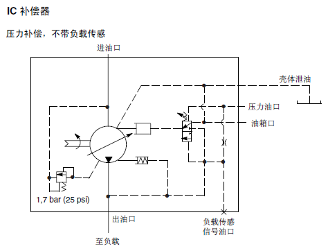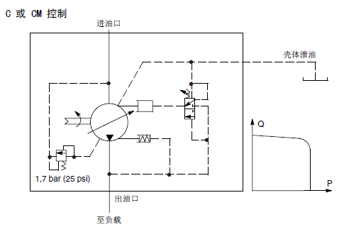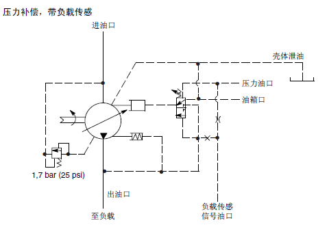 弹簧腔(控制)压力与出口压力之间隔着一个内部节流孔。当节流孔压降达到压差设定值时出口压力使阀芯移动,泵排量减小。