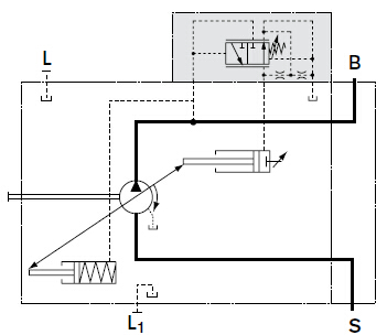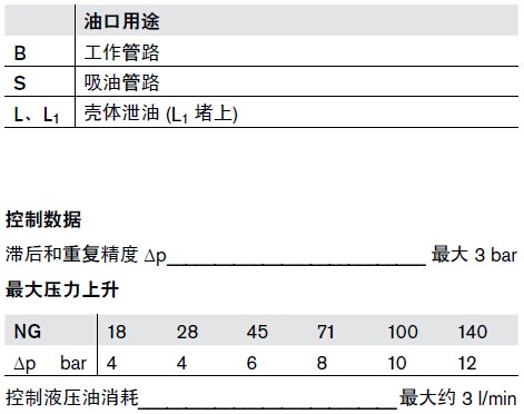 压力控制将泵的最大输出压力限制在泵的控制范围内。变量泵仅提供执行器所需的液压油量。如果工作压力超过内置压力阀的压力无级点,泵将调节至较小排量,同时控制偏差将随之减小。可以无级调节控制阀的压力。